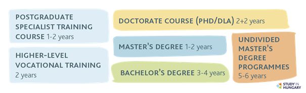 在匈牙利,高等教育研究分三个培训周期进行:学士课程、硕士课程和博士课程。不同层次的学习计划的长度是不同的。下图显示了匈牙利高等教育的结构: