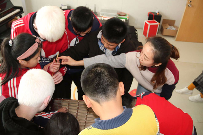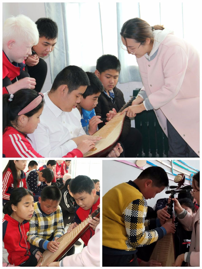我校高俊磊老师长期在盲校进行志愿服务,根据她的经验,志愿者为孩子们带来了平日里喜欢但没有机会接触的民族乐器。