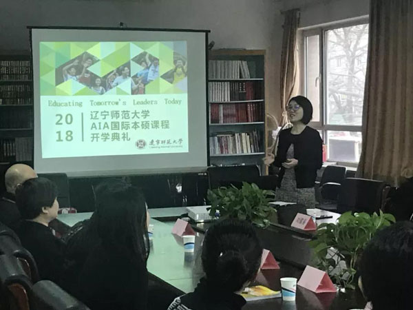 辽师大AIA首届春季开学典礼在校内召开,校内领导一一上台给新生说了寄语和祝福。
