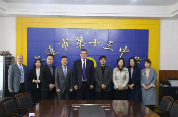 AIA国际会计师公会首席执行官Mr. Philip Turnbull与AIA国际会计师公会中国区代表陈振禄先生一行众人参观访问大连市第十三中学。受到了大连市第十三中学陶校长、姜副校长、国际部于主任等的热烈欢迎。