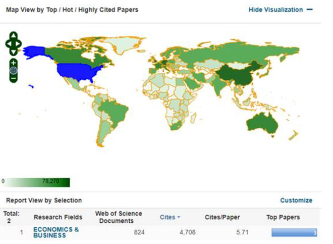 数据显示,近十年间(2010年1月1日至2020年1月31日)我校共计发表ESI论文1954篇,总被引12978次,高被引论文15篇。其中,在经济学和商学学科领域发表ESI论文824篇,总被引用4708次,篇均被引5.71次,高被引论文3篇。