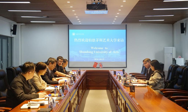 国际交流合作处负责人对伯恩茅斯艺术大学一行的到来表示欢迎,介绍了我校的历史概况、专业设置、可合作的相关专业情况和近年来在教学、科研和艺术实践中取得的成绩。蒂姆·梅特卡夫介绍了伯恩茅斯艺术大学的历史、专业设置、学科优势和国际交流方面的情况。双方就多方位、多形式开展交流进行了具体讨论,并一致表示,将根据实际情况,确定具体实施项目,开展实质性合作。会后,蒂姆·梅特卡夫一行参观了设计学院2024年毕业作品展和山东年画雕版博物馆。