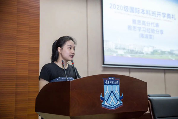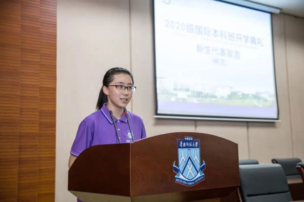 2020级新生代表林灵是语言10班的班长,她分享了自己进入华师国商国际本科班这个大家庭两个多星期的学习心得和感受,体会到华师大老师、辅导员、兼班的认真负责和耐心。她说,如果用一个词形容华师大,那就是“温暖”。她还和同学们分享了接下来大学生活的规划,希望同学们和她一样珍惜时间,把握机会,积极参加学生会活动、扩展人脉,锻炼能力。