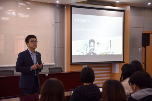 宣讲会上,首先由唐桢璟对就业力大比拼赛事的报名、参赛、奖励等相关流程和注意事项做了详细介绍。之后,苑硕从同学们感兴趣的面试技巧出发,结合个人经历,对戴姆勒的企业文化、招聘时间、招聘流程进行介绍。宣讲会最后,兰君对到场学生进行项目动员。