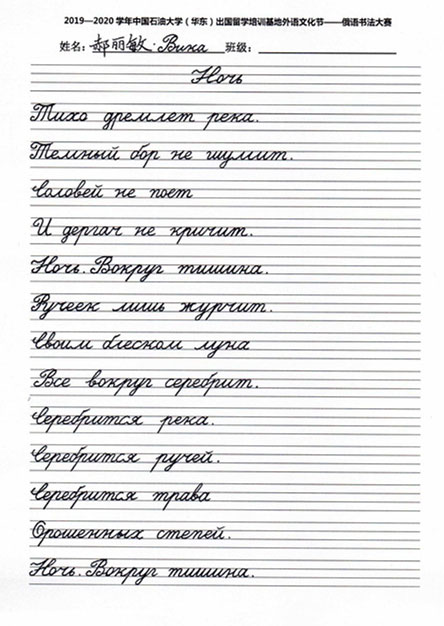 为丰富出国留学培训基地学生文化生活,提升学生综合素养,陶冶情操,中国石油大学(华东)出国留学培训基地于11月18日晚举行“俄语书法大赛”。