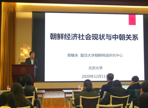 发布时间:03-02 来源:留学桥2020年12月11日,北京大学外国语学院朝鲜(韩国)语言文化系主办的第五十二次“感知韩国系列文化讲座”在民主楼208会议室举行。本次讲座的主题为“朝鲜社会现状与中朝关系”,主讲人是复旦大学国际问题研究院郑继永教授。朝(韩)语系主任王丹教授等系内师生五十余人和延边大学朝鲜韩国研究中心的两位老师到场聆听了讲座。