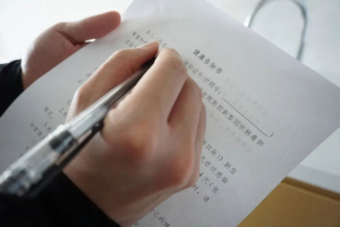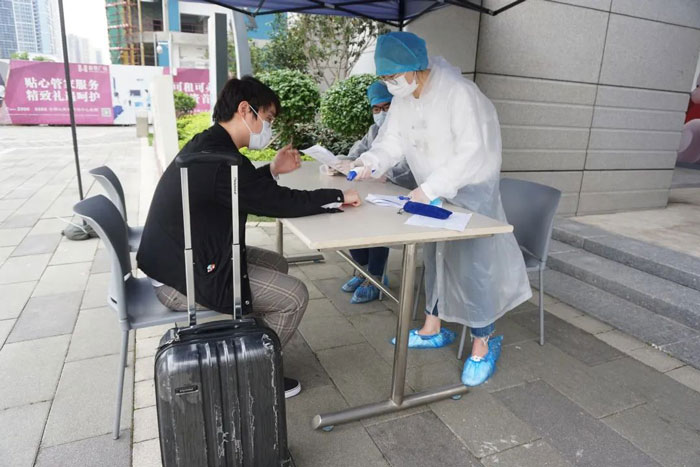 上午9点,应急演练准时开始,首场演练模拟的为开学后学生返校报到的情景。“学生”以间隔1.5米的距离,排队依次接受体温检测,体温正常的学生方可进入学院,提交“健康卡”并办理返校/入学手续。现场发现一名体温异常并伴有乏力症状的学生,相关负责老师立即转移该学生至室外临时观察区,使用水银温度计重新测量体温并核对其出行信息。确认学生体温存在异常后,负责教师立即联系医院进行进一步现场诊断、汇报党政办及分管领导有关情况,并通知学生紧急联系人。宿管人员将学生行李消毒后送往隔离观察区,保洁人员对重点区域进行消毒。