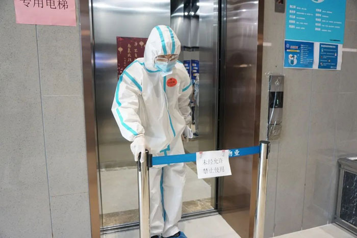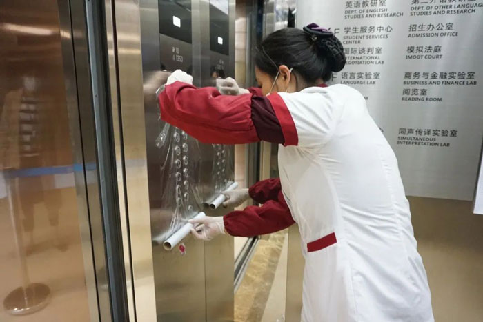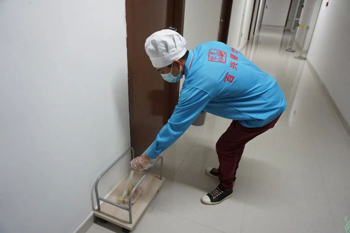 第二场演练模拟的为发热学生返回学院的操作流程。演练现场,一名学生经乐从医院诊断,排除新冠肺炎感染可能性,返回学院隔离观察区内自我隔离14日。该名学生到达学院后,相关负责老师引导学生使用专用电梯前往隔离观察区28层,告知学生隔离注意事项并指引学生签署“隔离同意书”,保洁人员对该学生所经区域及时进行消毒。同时,现场还演练了无接触配餐及无接触清理垃圾的操作流程。