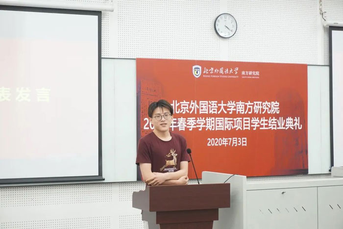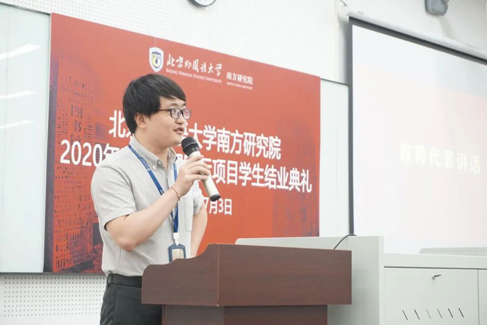 教师代表曹雪城老师对同学们提供了“三自”的要求,即自省、自律和自立。他表示同学们即将踏出国门深造,希望大家时常自省、做到自律、实现自立,最终实现自己梦想。最后,他祝贺各位同学顺利结业,并祝愿各位同学在未来寻找到自己闪光点,实现人生价值。