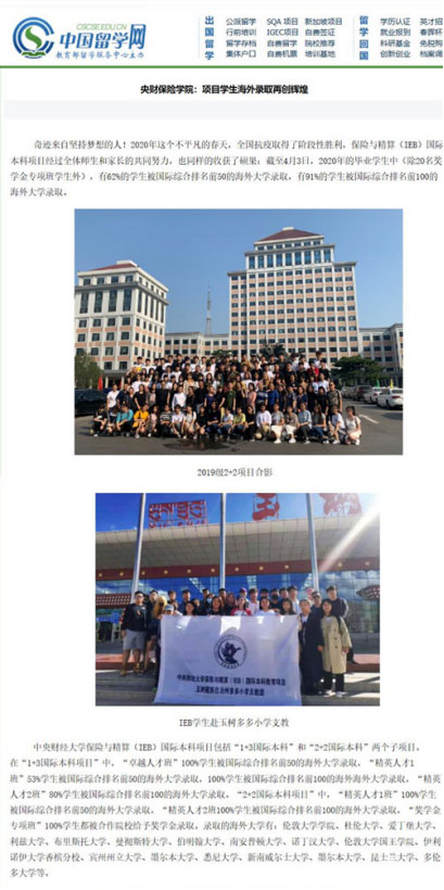 发布时间:01-29 来源:中央财经大学保险学院中央财经大学IEB国际本科教育项目是中国(教育部)留学服务中心和中央财经大学战略合作伙伴关系下的出国留学项目,培养单位为中央财经大学保险学院、中国精算研究院。目前与英、美、澳、加、爱尔兰、韩国等国家的多所大学建立了1+3国际本科、2+2国际本科课程豁免和奖学金合作关系。学院具有丰富的出国留学培训经验,并取得了骄人的成绩,自项目举办以来,秉承追求卓越的办学宗旨和人才培养目标,力求把项目办成全国最具品牌影响力的留学项目;以“把我们的学生培养成为国际出类拔萃高校的高素质人才,培养成为中华民族的栋梁之才,培养成为中华民族的骄傲、中央财经大学的骄傲”为办学宗旨。集中一切优质资源,凭借高师资配备,中外联合培养的课程体系,严格的教学管理制度和注重成长关怀的管理模式培养出一批批学术水平和综合素质兼优的卓越学子。打造了中央财经大学IEB国际本科教育项目在国内外的良好口碑和影响力。