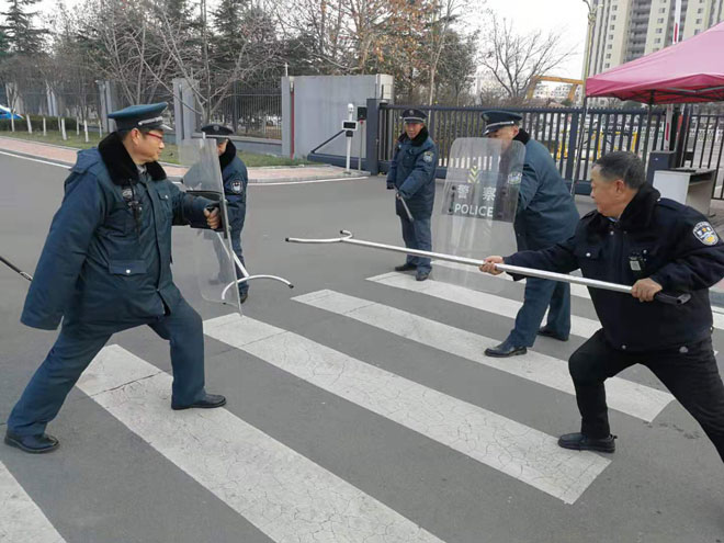点击查看全文12月23日下午潍坊文华学校安保处进行了反恐怖防范技能训练。保安队员首先进行基本的列队站队,然后由保安班长讲解钢叉、盾牌、橡胶棍等安保器械的使用方法,并进行了训练。训练的目标是保安队员人人能够熟练使用安保器械,应对可能出现的突发事件。