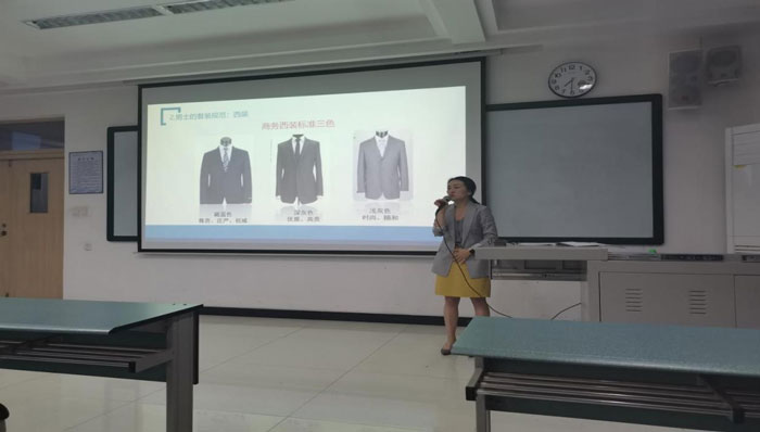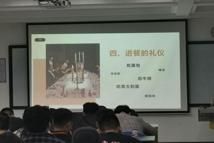 袁老师以礼仪的由来和概况作为开端,引出了讲座主题:涉外礼仪的重要性和基本要求。过程中着重向同学们介绍了接待礼仪、电梯礼仪、乘车礼仪和会谈礼仪。为了更好的结合实际情况,袁老师还邀请现场同学们参与到模拟情景中来,增加了讲座的趣味性和学生的参与感。除此之外,袁老师通过展示丰富的图片和生动的视频对仪表风度礼仪、用餐礼仪进行了具体的讲解分析,细节之处加以示范和解读,内容丰富涵盖全面。