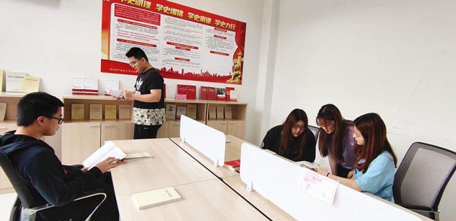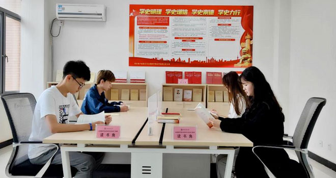 党史学习阅读角——设立学生读书角,学生自学为主,结合主题班会、行家党课、专题讲座、研讨会等多种形式,促进学生认真学习《中国共产党历史大学生读本》、《中华人民共和国史大学生读本》、《改革开放史大学生读本》、《社会主义发展史大学生读本》、《道路何以自信》、《理论何以自信》、《制度何以自信》、《文化何以自信》等书目。