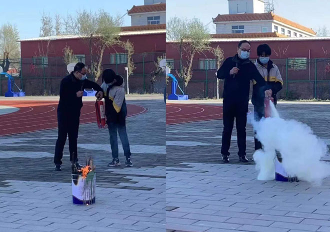 学生们还逐个实操如何使用灭火器灭火。1提,提起灭火器。2拔,拔掉保险销。3握,握住喷管最前端。4对,对准火焰根部。5喷,往下按压阀,对准火焰喷射。学生们按照教师指导的动作要领,稳、准、狠的将火源喷灭。