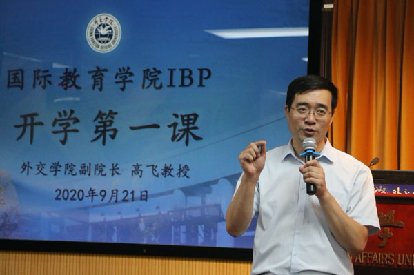 发布时间:02-04 来源:外交学院国际教育学院2020年9月21日下午,外交学院副院长高飞教授在沙河校区为国际教育学院IBP项目2020级学生讲授“开学第一课”,101名新生认真听讲,踊跃提问。