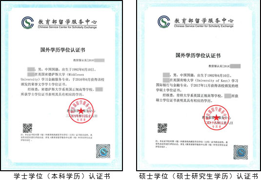 2018,为进一步服务归国人才,优化认证服务流程,教育部修订发布《教育部留学服务中心国(境)外学历学位认证评估办法》。自2019年5月起,全国试行“互联网+国(境)外学历学位认证服务”,即留学归国人员国(境)外学历学位将由传统纸质版认证形式改为在线电子证照认证和在线查询。国(境)外学历学位经中国教育留学部服务中心认证后,具备国内统招全日制学历同等效力。