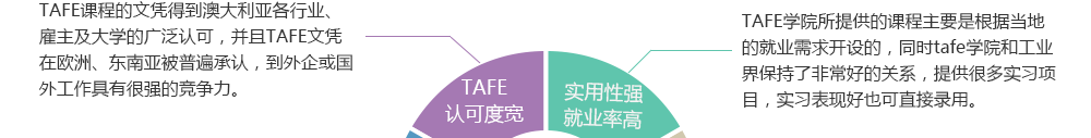 TAFE是Technical and Further Education的简称,即技术与继续教育,它作为澳大利亚一种独特的职业教育培训体系存在至今已有100多年的历史。TAFE隶属于澳大利亚政府的各州教育部,是南半球大的高等教育系统,是国家职业教育和培训 (VET) 的主要提供者,也是全球成功的特色鲜明的教育体系之一。TAFE还是世界上为数不多的通过ISO9001认证的教育体系,是注册的培训机构 RTO。"毕业即就业","帮助每个学生尽快找到工作",是TAFE学院的教育理想和终极目标。澳大利亚TAFE体系在全球均有其分支机构。TAFE 的文凭得到了澳大利亚所有大学、美国、国际大学联盟(IUA)和英联邦国家的认可。澳大利亚政府规定只有取得TAFE证书才能从事相关的技术性工作。这就使得TAFE文凭的价值远高于其他证书文凭。TAFE高等文凭由澳大利亚政府颁发,相当于中国的高等职业教育(大专)层次。