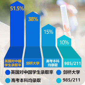 2024年英国对中国学生录取率51.1%,剑桥、牛津分别为14.86%、10.3%,而国内高考本科均录率38%,985/211仅5.4%,北大约 0.01%。