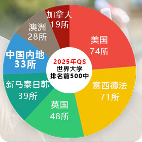 在2025QS年世界大学排名前500中,中国内地33所、美国74所、英国48所、澳洲28所、加拿大19所、新马泰日韩39所、意西德法71所。